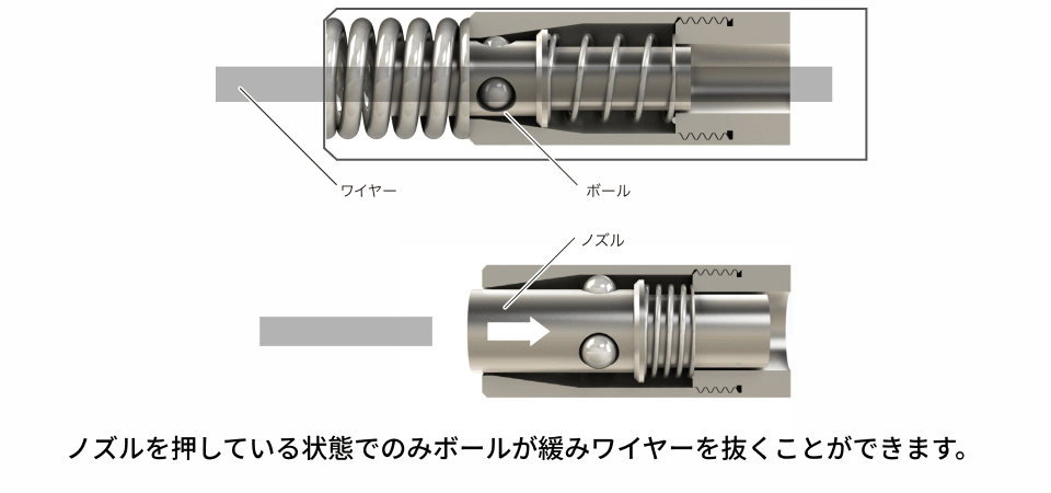 ワイヤーを挿し込むだけでボールがしっかりとワイヤーを締め付け、ワイヤーが抜けなくなります。