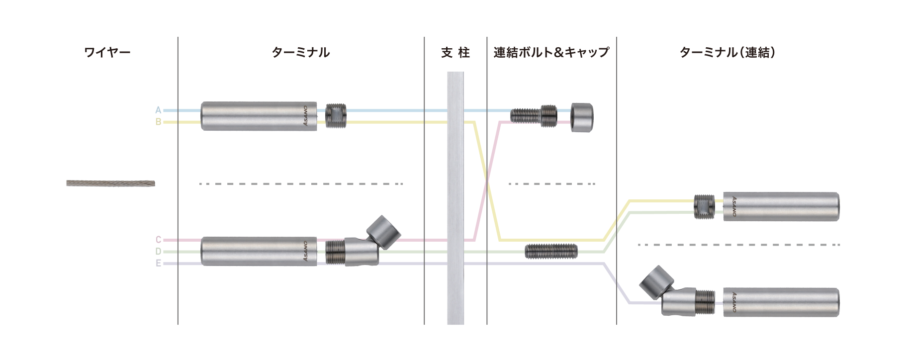 現場での取付作業、調整がとてもカンタンです。ばね+ワイヤーグリップ構造