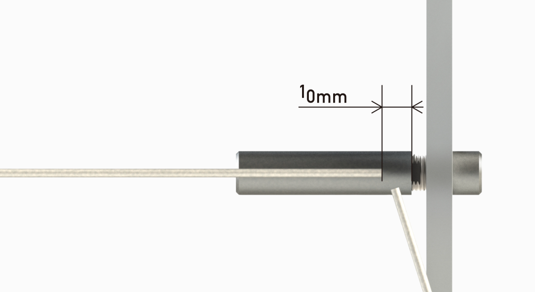 ワイヤーを挿し込んだ反対側のSEターミナルへ、ワイヤーをたわみがなくなる程度に引っ張り、長さを調整します。SEターミナルの端部から10mmの箇所でワイヤーを切断する。